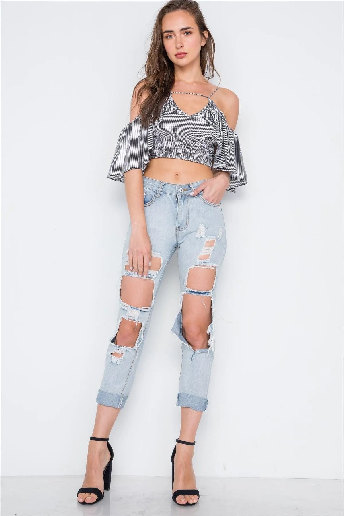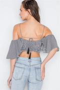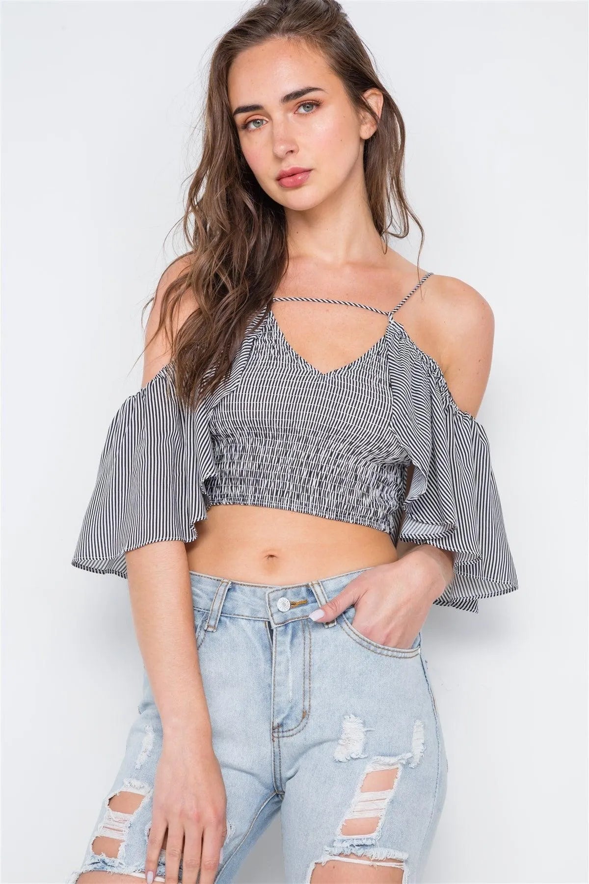 Top features: smocked, cami straps that tie in the back, off-the shoulder flounce sleeves, stripe print allover, crop lengthModel is 5'9 wearing a size Small ( Waist: 24", Bust: 32A, Hips: 34")Size Small Item Measurements: Length: 14" Bust: 34", Sleeves: 7"True to sizeAvailable in Blue
