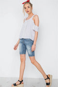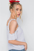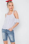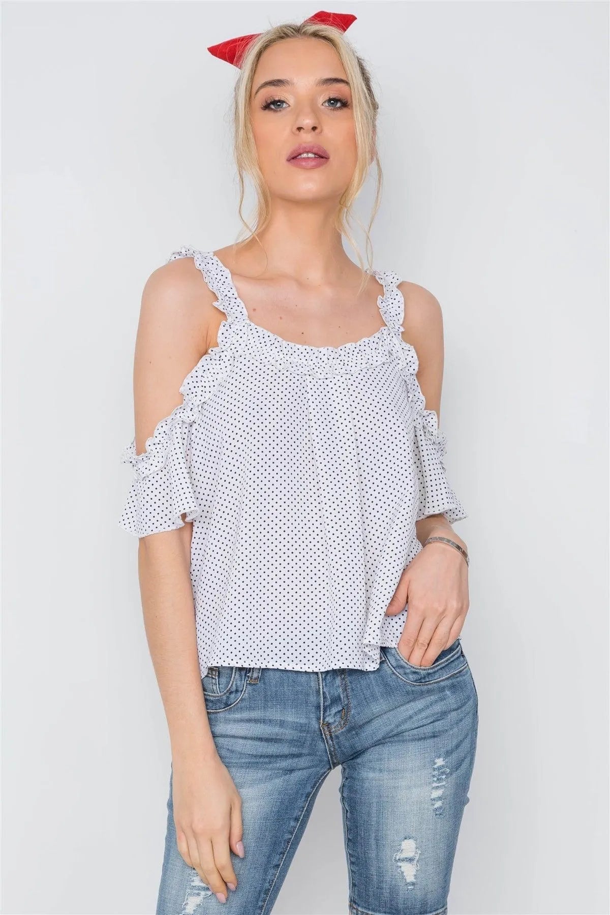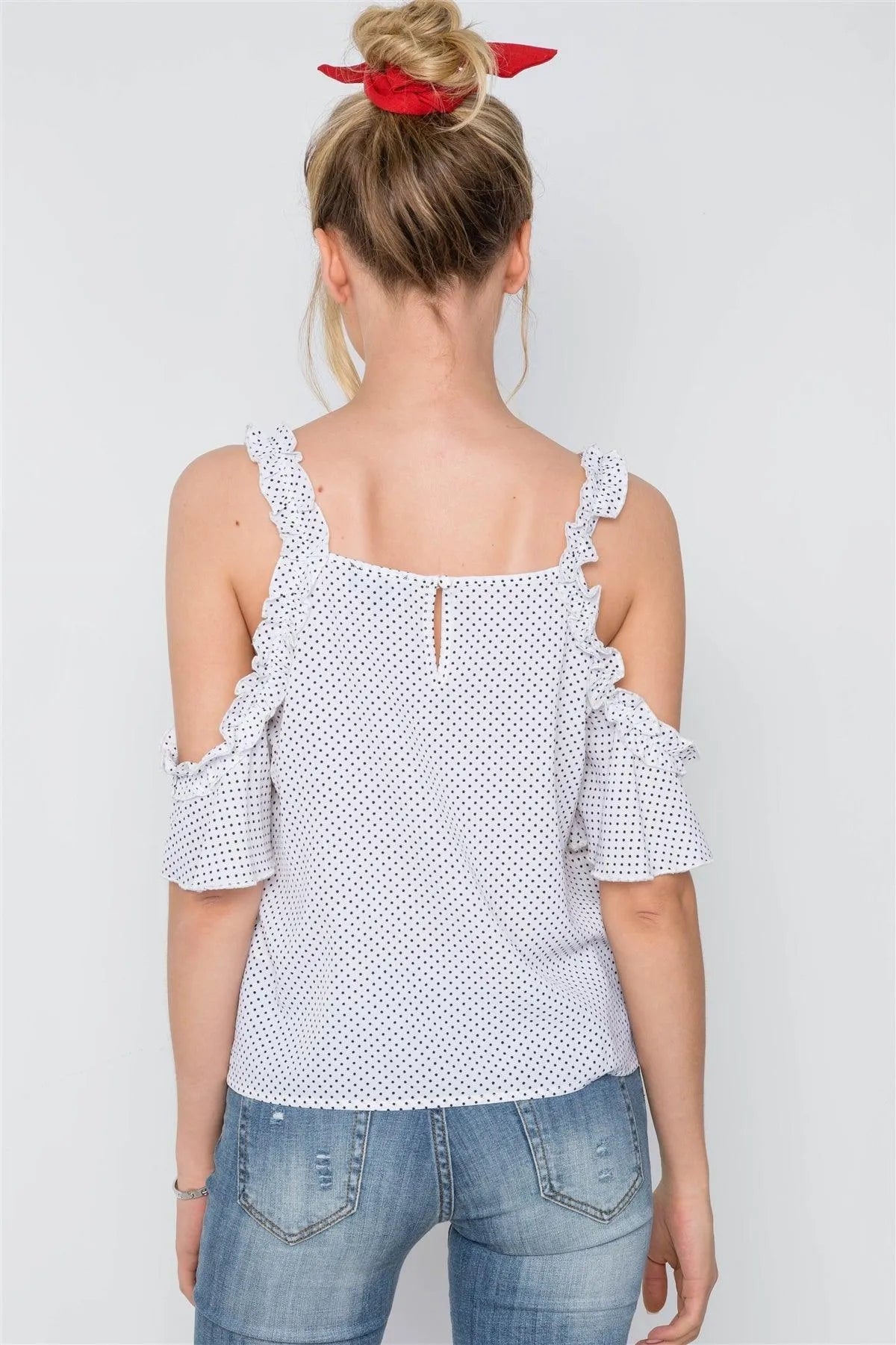 White Polka Dot Ruffle Hem Cold Shoulder Top
