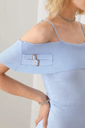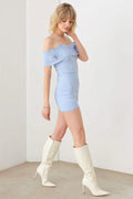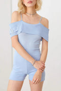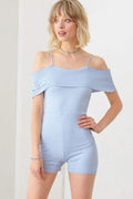 Light Blue Knit Ruffle Bust Off-Shoulder Short Romper with Belt