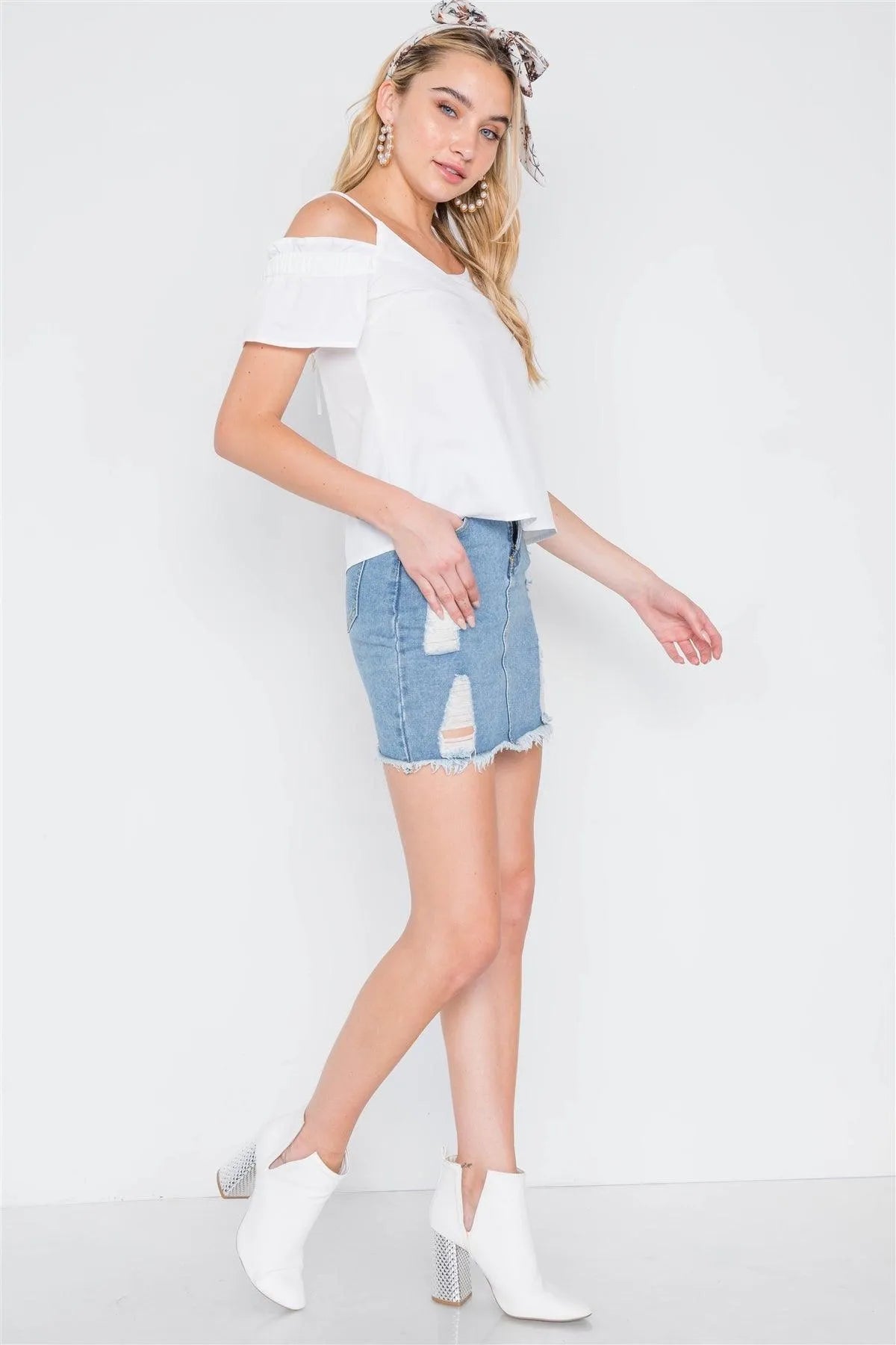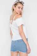 Top features: adjustable cami straps, elasticized off-the-shoulder sleeves, self-tie support straps int the back, solid, unlinedModel is 5'8 wearing a size Small ( Waist: 24", Bust: 32B, Hips: 34")Item measurements: Length: 23", Bust: 34", Sleeves: 5.5"True to size