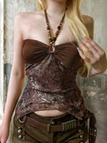 Elevate your outfit with this retro-meets-modern halter neck mesh crop top, designed for the bold and confident. The top features a ruched bust area made of stretchy polyester in a rich chocolate brown hue, perfectly shaping your curves. The flowing mesh overlay below is adorned with floral patterns and crafted into a unique handkerchief hem that dances with every step.